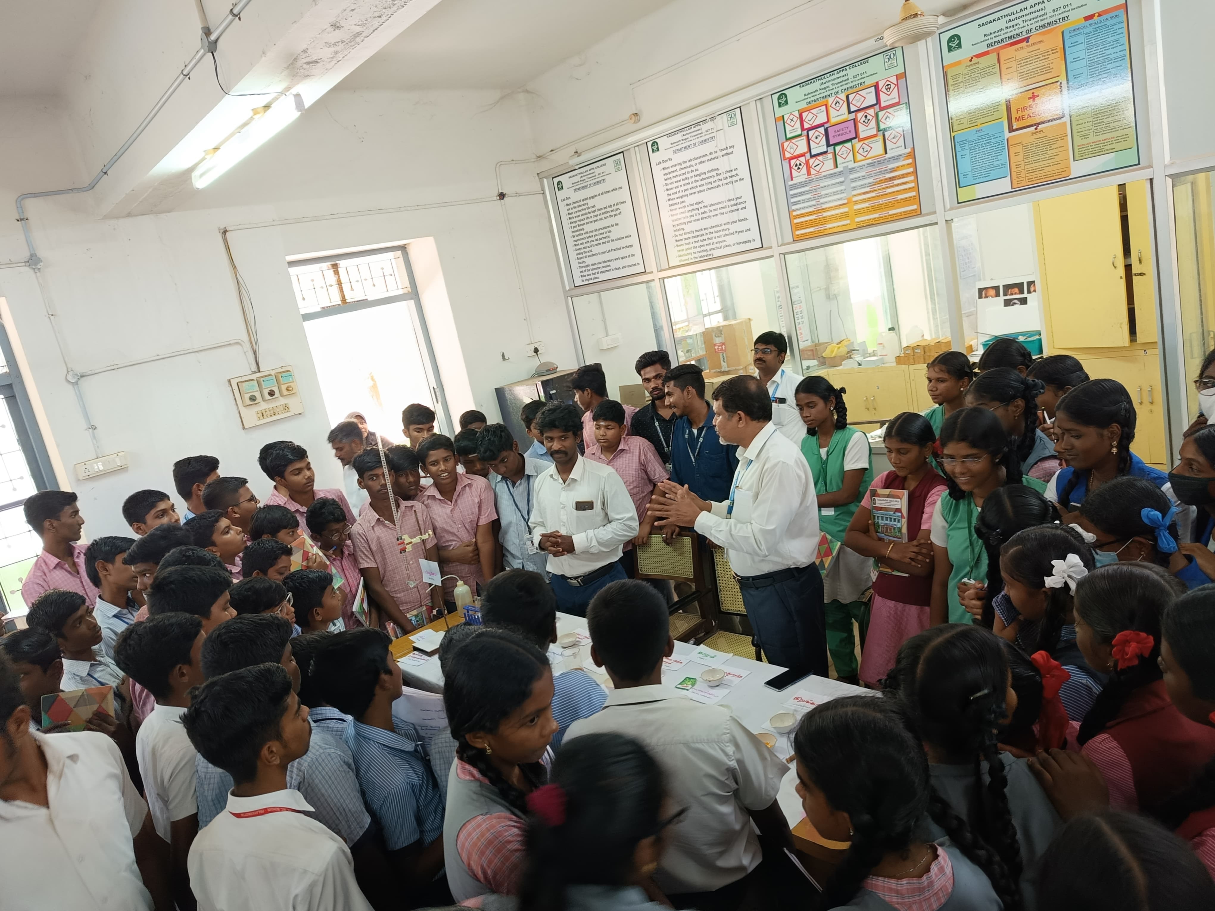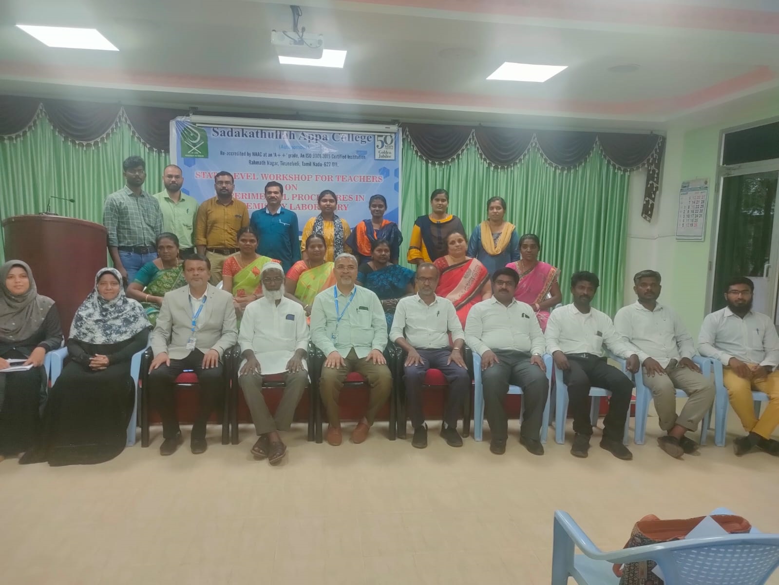 The Department of Chemistry organized State - Level Workshop for Teachers on Experimental Procedures in Chemistry Laboratory on 04.08.2023 and 05.08.20. During day 1, the Inaugural Session started in the Seminar Hall at 09.30 am. A total of 21 teachers from Muhyiddeen Matric Higher Secondary School, Kayalpattinam, L.K. Matric Higher Secondary School Kanchi Sri Sankara Matric Higher Secondary School, Tiruchendur, Kanchi Sri Sankara Vidhyashram, Tiruchendur, Pushpalata Vidya Mandir, Palayamkottai, Pushpalata Matric Higher Secondary School, Palayamkottai Muthamil Public School, CSI Matric Higher Secondary School, Cathedral Higher Secondary School Vannarapettai and Francis Xavier School, Vannarapettai participated in the workshop. Dr. A. Syed Mohamed, Associate Professor & Head of Chemistry explained the theme of the State - Level Workshop for Teachers on Experimental Procedures in Chemistry Laboratory. He emphasized that practical is the key component in the curriculum. The first session is Systematic Analysis of Organic compounds conducted by Dr. I. Antony Danish and Dr. Fathima Shahana. They demonstrated the analysis of functional groups and preparation of derivatives. The teachers actively participated and analyzed different functional groups. The second session is Crystallization demonstrated by Dr. S. B. Mohamed Khalith. During the second day, session three is handled by Dr. M. Sheik Muhideen Badhusha and Dr. P. Anvar Kasim on Inorganic Qualitative Analysis- Salt Analysis. They demonstrated the analysis of cations, anions and removal of interfering anions. Participants actively participated in analyzing the salts. Session four is Inorganic Quantitative Analysis- Volumetric Estimation conducted by Dr. M. A. Sabitha and Dr. S. B. Mohamed Khalith. They explained the different types of titrations and demonstrated the estimation of calcium. The teachers are provided with unknown solutions to perform complexometric titration. Session five is Chromatographic Techniques carried out by Dr. I. Antony Danish and Dr. S. Brillians Revin. They demonstrated the Thin Layer Chromatography and Paper Chromatography respectively. The teachers clarified their doubts. Dr. T. Syed Ismail, Former Associate Professor, Department of Chemistry, Sadakathullah Appa College delivered the Valedictory Address. He distributed the Certificates to the participants. Dr. A. Syed Mohamed is the Convener, Dr. M. Sheik Muhideen Badhusha is the Co-convener, Dr. M. A. Sabitha and Dr. M. Fathima Shahana are the Organizing Secretaries for the workshop.