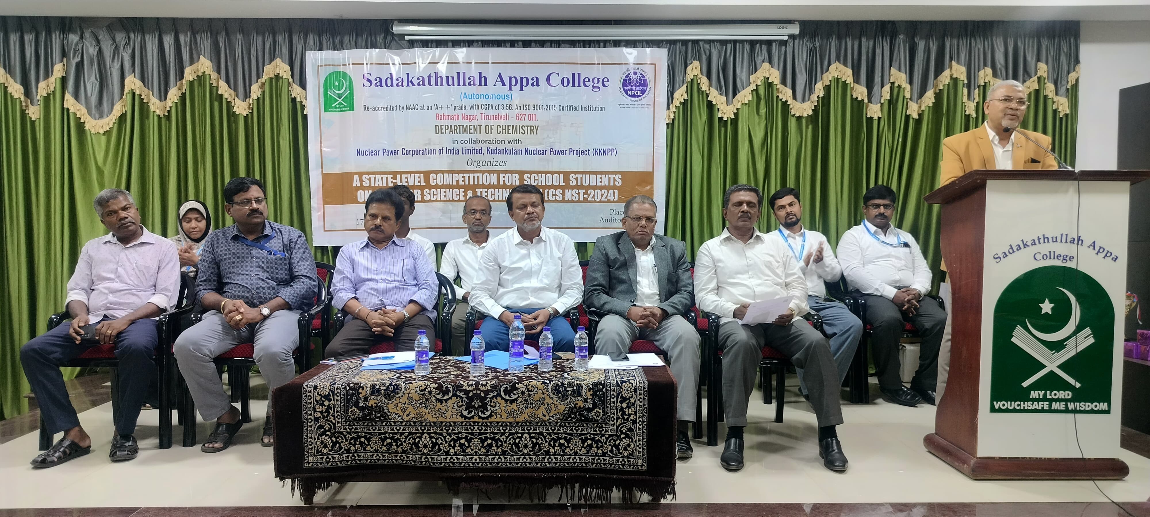 The Department of Chemistry in association with Nuclear Power Corporation of India, Kudankulam, organized a State Level Competition for School students on Nuclear Science and Technology– CS NST 2024 on 17.10.24 at Auditorium. Nuclear Power Corporation of India, Kudankulam sponsored an amount of Rs. 33,000/- for the programme. Mr. N. Sundaravadivel, Senior Manager, Finance & Accounts and Mr. R. Velmayil Murugan, Senior Assistant-I, Human Resource Group, Kudankulam Nuclear Power Project, inaugurated the competition. Models of Kudankulam Nuclear Power Project were portrayed in the Auditorium. Mr. R. Velmayil Murugan is one of the prominent Alumni, graduated B. Sc., Chemistry from our college in the year 2000. Nearly 2100 participants from Schools and the College visited the exhibition. 158 students from 13 Schools such as Kanchi Sankara Vidhyashramam, Tiruchendur, Kanchi Sri Sankara Academy Matric Higher Secondary School, Tiruchendur, Rose Mary Public School, V.M. Chatram, Pushpalata Vidya Mandir, Palayamkottai, St. Xavier’s Higher Secondary School Palayamkottai, Sri Jayendra Swamigal Silver Jubilée Matric Higher Secondary School, Zareena Fathima Matric. Higher Secondary School, Magdalene Matric Higher Secondary School, Sarah Tucker Higher Secondary School for Girls, Pushpalata Matric Higher Secondary School, Servite Matric Higher Secondary School, IIP Laxmi Raman School and Sri Jayendra Swamigal Vidhya Kendra Senior Secondary School participated in the events. The Valedictory Address was delivered by Mr. N. Sundaravadivel, Senior Manager, Finance & Accounts and Mr. R. Velmayil Murugan, Senior Assistant-I, Human Resource Group, Kudankulam Nuclear Power Project, at 4.00 pm followed by Prize distribution. The overall Rolling Trophy was won by Pushpalata Vidya Mandir, Tirunelveli. Dr. S. Mahadevan, Associate Professor & Head, Department of Tamil, served as judge for Tamil Elocution, Dr. Dr. K Hema, Assistant Professor, Department of English served as judge for English Elocution, Mr. R. Velmayil Murugan and Mr. N. Sundaravadivel serve as judges for Model Exhibition and Chemgoli. Dr. Dr. A. Syed Mohamed is the Convener, Dr. M. Sheik Muhideen Badhusha is the Co-convener and Dr. M. Thameem Ansari is the Organizing Secretary. The prize winners list is given below: