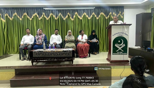 The programme included a welcome address by Dr. M. Sulthana Barvin, Associate Professor and Head of the Department. The presidential address was delivered by Dr. S. M. A. Syed Mohammed Khaja, Vice Principal. The programme concluded with a vote of thanks proposed by Dr. M. Esakkiammal, Assistant Professor and Head.