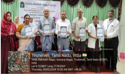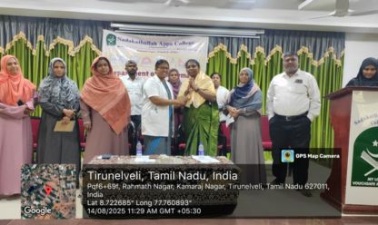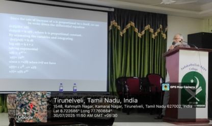 The Guest Lecture- II of the Mathematics Association for the academic year 2025 – 2026 was held on 05.01.2026 at 11.00 a.m. in the Auditorium, Sadakathullah Appa College (Autonomous), Tirunelveli. The programme started with Qirath. Dr. V. P. Asan Nagoor Meeran, Assistant Professor, Department of Mathematics, welcomed the gathering. Dr. S. M. Abdul Kader, Principal of the College delivered the Presidential Address. Dr. R. Janet Rani, Vice Principal of the college and Dr. S. Firthous Fatima, Assistant Professor and Head, Department of Mathematics gave the felicitation address. Dr. U. Jerseena, Assistant Professor, Department of Mathematics (PG) introduced the Resource Person. The Resource Person Dr. R. Radha, Assistant Professor, Department of Mathematics, Sri Paramakalyani College, Alwarkurichi delivered a Lecture on the topic “When Algebra Meets Graphs !?”. At the conclusion of the program, Dr. V. G. Smilin Shali, Assistant Professor, Department of Mathematics, proposed the vote of thanks. The programme provided academic enrichment to 105 participants, comprising Undergraduate, Postgraduate, and Research Scholars.