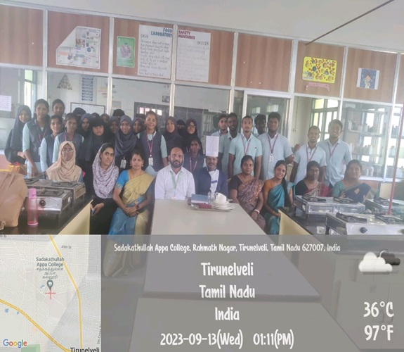 The III B.Sc Students of the Department of Nutrition and Dietetics, visited The Hotel Apple Tree on 17.08.2023. There they Visited the Food production area, and front office. Mr. Selva Kumar, Executive chef, Hotel Apple Tree, Tirunelveli, demonstrated about how to receive the guest, different types of napkin folding and various styles of services. Mrs. M. Vadivel Devi and Mrs. C. Aruna Sundari, Assistant Professors of the department of Nutrition and Dietetics, Sadakathullah Appa College, Tirunelveli gathered the students.