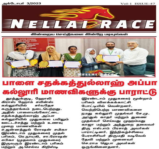 The students of the Department of Nutrition and Dietetics, sadakathullah Appa College, Tirunelveli participated in the Millet Food Festival organized by the Tamil Nadu Government, Department of Food Supply and Consumer Protection at the Porunai Nellie Book Festival – 2024. It was held on 11.02.2024 (Sunday). Students of the Department of Nutrition and Dietetics participated in the event along with professors and received a book coupon worth Rs.1500/-. The students won third prize and got certificates. Dr. S.M. Abdul Kader, Prinicpal, Sadakathullah Appa College and Dr. S. M. A. Syed Mohammed Khaja, Vice-principal, Un-aided course presented the award for the students and appreciated the work done by the students. Mr. S.M. Prasad, Head and Assistant Professor, Department of Nutrition and Dietetics directed the students. Mrs. M. Vadivel Devi, Mrs. C. Aruna Sundari, Assistant Professors, department of Nutrition and Dietetics, guided the students and helps them to participate actively in this event.