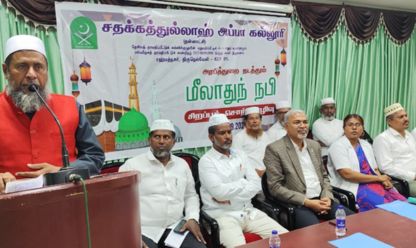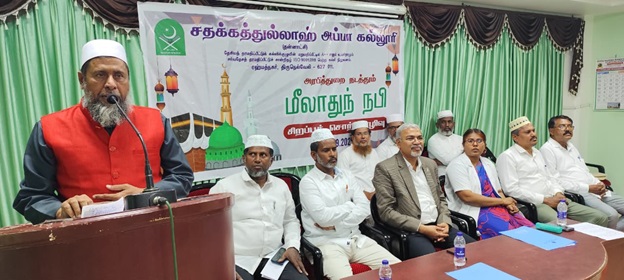 பாளை, சதக்கத்துல்லாஹ் அப்பா கல்லூரியில் மீலாது நபி சிறப்புச் சொற்பொழிவு 23.09.2025 இன்று நடைபெற்றது. நிகழ்ச்சிக்கு கல்லூரி முதல்வர் முனைவர் சே.மு. அப்துல் காதர் அவர்கள் தலைமை தாங்கித் தலைமையுரை ஆற்றினார். துணை முதல்வர் முனைவர். ரா. ஜேனட் ராணி அவர்கள் வாழ்த்துரை வழங்கினார். அரபித் துறைத் தலைவர் ஜெ. உபைதுல்லாஹ் அனைவரையும் வரவேற்றார். சிறப்பு விருந்தினராகக் கலந்து கொண்ட மெளலவி டி.எம்.என். ஹாமித் பக்ரி மன்பஈ, முதல்வர், அல்ஃபுர்கான் இஸ்லாமியக் கல்லூரி, தென்காசி அவர்கள் "நவீன உலகிற்கு நபிகளார் (ஸல்) அவர்களின் அழகிய வழிகாட்டல்" என்ற தலைப்பில் உரை நிகழ்த்தினார்கள்.