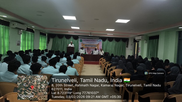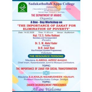 A one-day workshop on The Important Role Of Zakath In Elimination Of The Poverty was held on 14 February 2026 at the auditorium, Sadakathullah Appa College organized by the Department of Arabic. The Correspondent, Alhaj. T. E. S. Fathur Rabbani Sahib, presided over the function and delivered the presidential address. The Principal, Dr. S.M. Abdul Kader, offered the felicitation address. The President, Haji Wavoo W.S. Seyd Abdur Rahman, along with council members and the Wavoo family, graced the occasion. Prof. Mohamed Haneef, President of the Islamic Study Circle, and vice principal Janet Rani also participated. The special address was delivered by Maulavi. Abdul Azeez Baqavi, Chief Imam, Karumbu Kadai Jummah Masjid. He emphasized that Zakat is not a tax on the poor but a divine obligation upon the wealthy. While charity is encouraged in all religions, Islam uniquely makes it a compulsory duty. He highlighted that Zakat serves both to eradicate poverty and to purify the inner self. In the second session, the speaker Kaja Nizamudeen, Professor, Yousufia College, Dindugal explained: The categories of wealth on which Zakat is obligatory, The prescribed rates, Contemporary legal aspects.