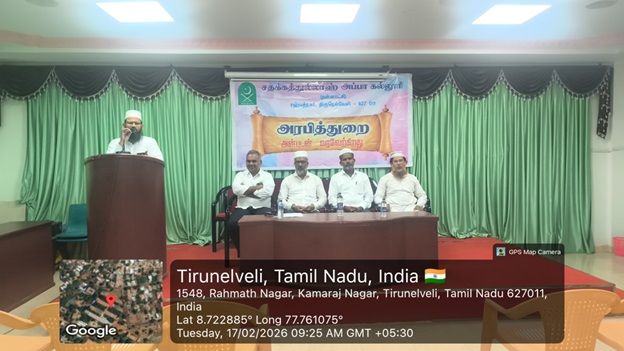 பாளையங்கோட்டை சதக்கத்துல்லாஹ் அப்பா கல்லூரியில் புதன் கிழமை (31.12.25) வாவு அறக்கட்டளைச் சொற்பொழிவு நடைபெற்றது. சிறப்பு சொற்பொழிவிற்குக் கல்லூரியின் தாளாளர் த.இ.செ. பத்ஹுர் ரப்பானி சாஹிப் தலைமையேற்று தலைமையுரை வழங்கினார்.
