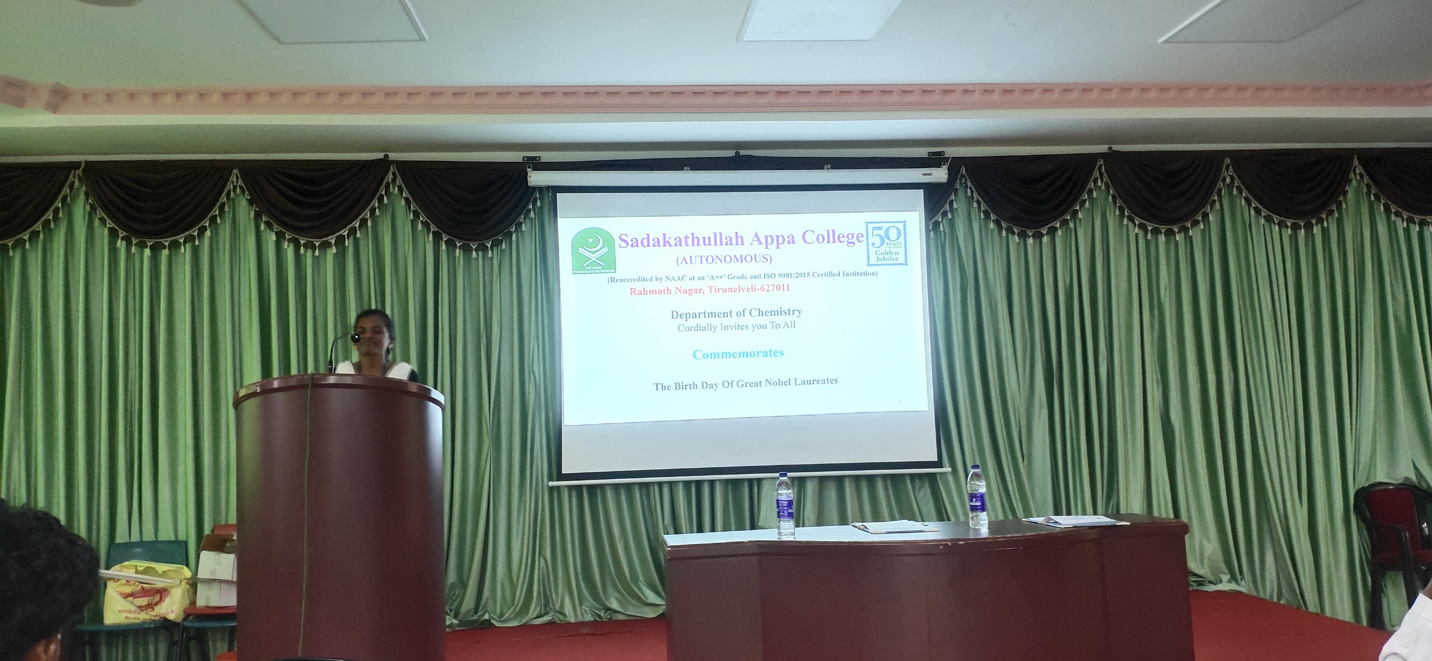 The Department of Chemistry organized Commemoration Day of Great Nobel Laureates- Akira Yoshino and Alan J. Heeger on 24.01.2025 in the Seminar Hall. Ms. S. M. Aathila and Ms. Krishnaveni, II M. Sc., Chemistry presented the ‘Achievements of Akira Yoshino’ and ‘Achievements of Alan J. Heeger’ respectively. 130 students of B.Sc., Chemistry and M.Sc., Chemistry participated in the programme. Dr. I. Antony Danish organized the programme. Ms. S. M. Aathila and Ms. Krishnaveni of II M. Sc., Chemistry were honored with shield.