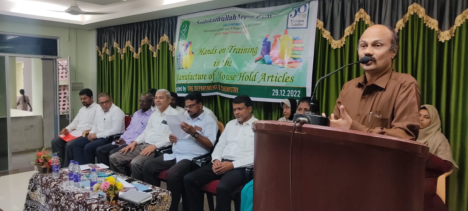 The Department of Chemistry in association with Sadakath Outreach Programme (SOP) and Training and Placement Cell organized a Hands- on Training in the Manufacture of House Hold Articles on 29.12.25 at Auditorium. Dr. C. Kannan, Associate Professor and Head, Department of Chemistry, Manonmaniam Sundaaranar University, Tirunelveli inaugurated the training. Mr. R. Joseph Vedamanickam, Trainer Chemical, MSME (Govt. of India), DFO, Madurai, Tamilnadu provided “Hands on Training in the Manufacture of House Hold Articles”. 160 students of UG and PG Chemistry participated in the programme and benefitted. 41 students of II B. Sc., Chemistry and 23 students of I M. Sc., Chemistry along with Dr. M. Thameem Ansari and Dr. P. Anvar Kasim went to Burkitmanagaram and gave hands-on training to the public for manufacture of household articles. Dr. A. Syed Mohamed is the Convener, Dr. M. Sheik Muhideen Badhusha is the Co-convener and Dr. M. Thameem Ansari is the Organizing Secretary.