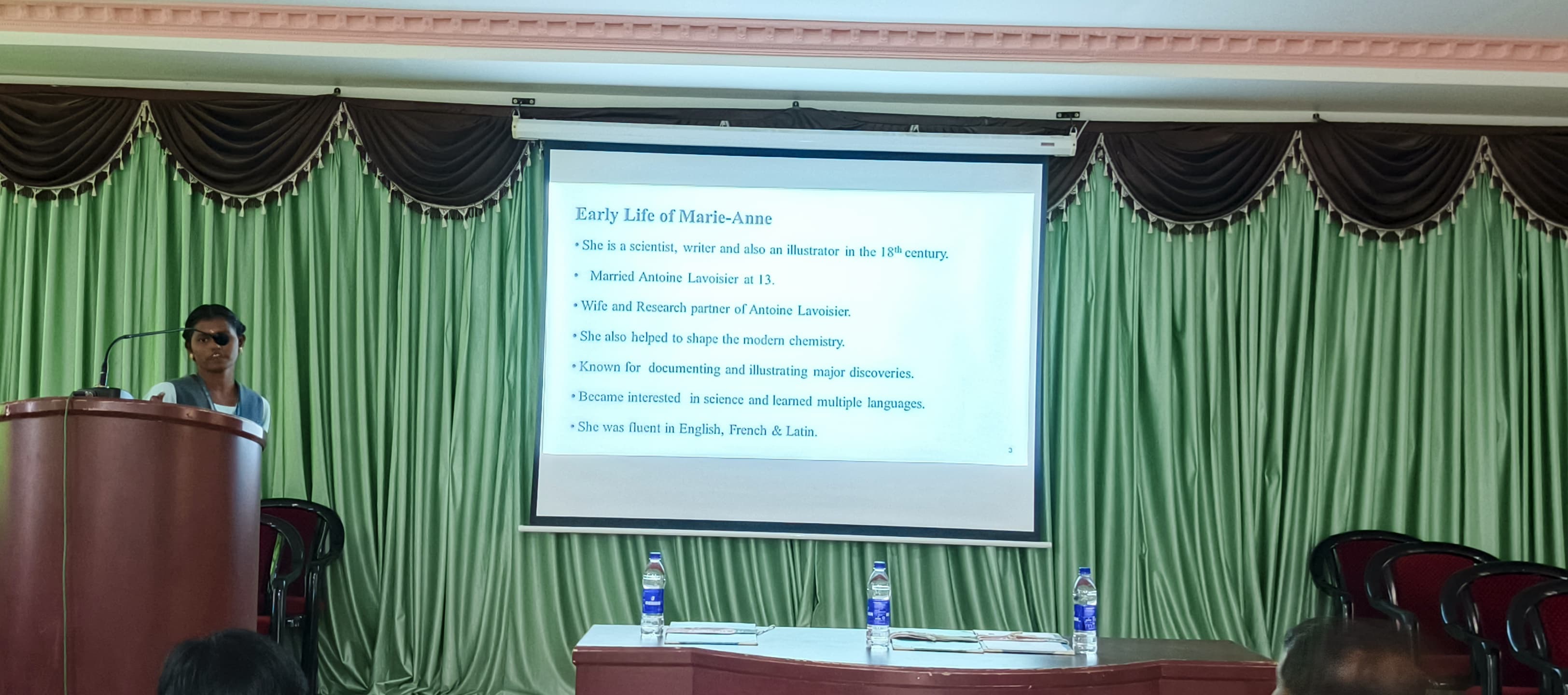 The Department of Chemistry organized Commemoration Day of Rosalind Franklin and Marie-Anne Paulze Lavoisier on 21.02.2025 in the Seminar Hall. The entire programme was organized by women staff and students under SDG5 to conduct Gender Equality recommended by United Nations Educational, Scientific and Cultural Organization (UNESCO). K Deepalakshmi and S Kiruthika Rajee, III B.Sc., Chemistry presented the ‘Achievements of Marie-Anne Paulze Lavoisier’ and ‘Achievements of Rosalind Franklin’ respectively. 147 students of B.Sc., Chemistry and M.Sc., Chemistry participated in the programme. M. A. Sabitha organized the programme. K Deepalakshmi and S Kiruthika Rajee, III B.Sc., Chemistry were honored with shield.