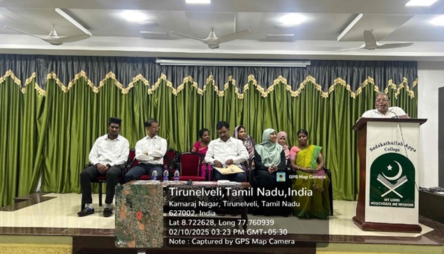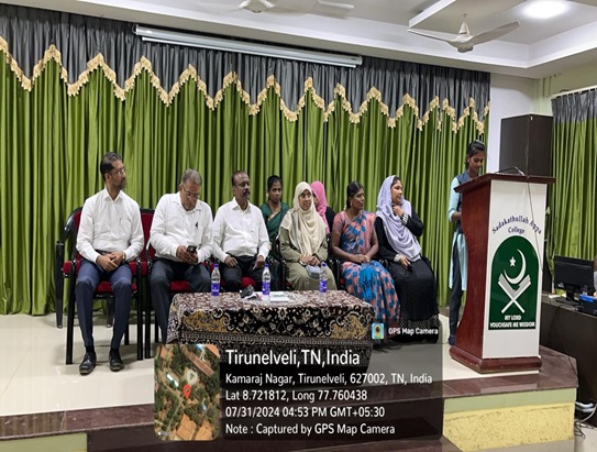The programme included a welcome address by Dr. M. Sulthana Barvin, Associate Professor and Head of the Department. The presidential address was delivered by Dr. S. M. A. Syed Mohammed Khaja, Vice Principal. The programme concluded with a vote of thanks proposed by Dr. M. Esakkiammal, Assistant Professor and Head.