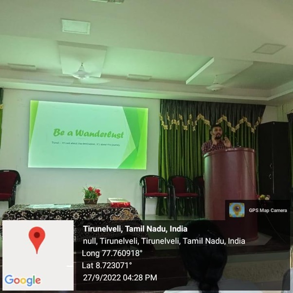 The UG Department of English (Unaided) organized a Guest Lecture with a view of celebrating the World Tourism Day on 27/09/2022 at 3:30 pm in the College Auditorium. Mr. S. Manikandan, Technical Manager, Rumango Software Solutions, Bengaluru, consented to be the Resource Person. He delivered a talk on Be a Wanderlust. The talk focused on the significance of travelling. The talk also highlighted the acquisition of skills and values obtained from travelling. The Principal Dr. S M Abdul Kader and the Vice Principal Dr SMA Syed Muhammed Khaja, the Dean of Arts Dr. S Mohamed Haneef and the faculty from the Department of English were present in the function. The entire program was conducted by the Department students.