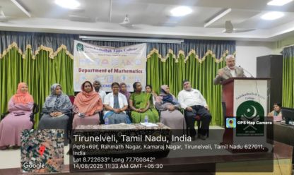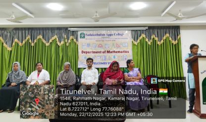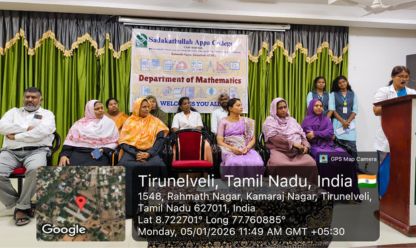 The Department of Mathematics celebrated National Mathematics Day on 22.12.2025 at 10.00 a.m. in the Auditorium, Sadakathullah Appa College (Autonomous), Tirunelveli. The Resource Person Mr. S. B. S. Younus, Assistant Professor, Department of Computer Science (Unaided), Sadakathullah Appa College, Tirunelveli delivered a lecture on the topic “Mathematics: The Foundation of Modern Computing”. There are 100 students attended in this programme. The Department conducted math competitions for our students. Seventeen teams participated in the model presentation and fifteen teams participated in the theme of Mathematics. Dr. V. Roseline, Head & Assistant Professor, Department of Computer Science (PG), Sadakathullah Appa College, Tirunelveli and Dr. Asweel Ahamed A Jaleel, Assistant Professor, Department of Physics, Sadakathullah Appa College, Tirunelveli, are acted as a judge for the competition. The best three model presentation and Rangoli designs were awarded.