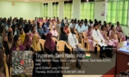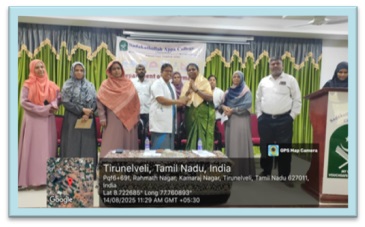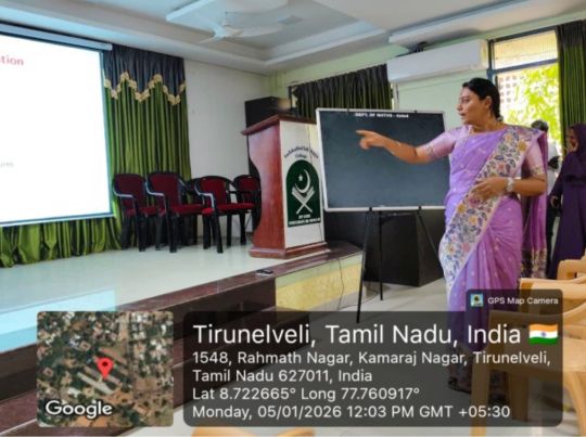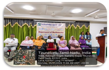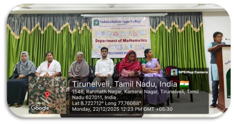The Guest Lecture- II of the Mathematics Association for the academic year 2025 – 2026 was held on 05.01.2026 at 11.00 a.m. in the Auditorium, Sadakathullah Appa College (Autonomous), Tirunelveli. The programme started with Qirath. Dr. V. P. Asan Nagoor Meeran, Assistant Professor, Department of Mathematics, welcomed the gathering. Dr. S. M. Abdul Kader, Principal of the College delivered the Presidential Address. Dr. R. Janet Rani, Vice Principal of the college and Dr. S. Firthous Fatima, Assistant Professor and Head, Department of Mathematics gave the felicitation address. Dr. U. Jerseena, Assistant Professor, Department of Mathematics (PG) introduced the Resource Person. The Resource Person Dr. R. Radha, Assistant Professor, Department of Mathematics, Sri Paramakalyani College, Alwarkurichi delivered a Lecture on the topic “When Algebra Meets Graphs !?”. At the conclusion of the program, Dr. V. G. Smilin Shali, Assistant Professor, Department of Mathematics, proposed the vote of thanks. The programme provided academic enrichment to 105 participants, comprising Undergraduate, Postgraduate, and Research Scholars.