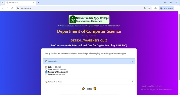 To celebrate UNESCO’s International Day for Digital Learning, the Department of Computer Science at Sadakathullah Appa College organized an engaging Online Digital Awareness Quiz on March 19, 2025. The quiz aimed to promote awareness and enhance students' understanding of emerging AI and digital technologies.